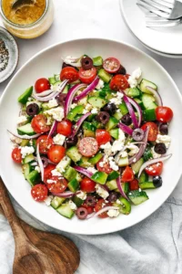 a simple, refreshing salad typically featuring fresh tomatoes, cucumbers, red onions, green bell peppers, Kalamata olives, and feta cheese.
